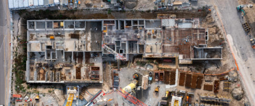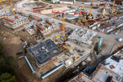 Photo de droite : un bâtiment s'élève seul dans l'opération OPAL (îlot B). Il s'agit du local pour le transformateur électrique qui alimentera notamment les îlots B et C.