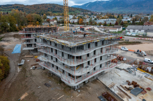 A gauche (îlot C) : on distingue les coffrages (en rouge sur le bâtiment de gauche) servant à la réalisation de ce que l'on nomme "voile banché" (béton armé coulé entre deux éléments de coffrage verticaux). Le résultat est visible sur le bâtiment de droite.